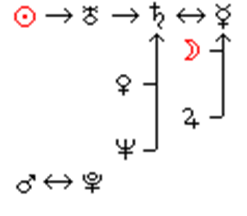 Интересно, что ретроградный Сатурн в 8 Доме (имеющий квинконс к соединению Меркурия с Нептуном), находится в Близнецах, диспозитором которых является Меркурий, а сам Меркурий детерминирован в 3 Доме в Козероге, диспозитором которого является Сатурн. Эта тесная связь Меркурия и Сатурна (рецепция) склоняла Салтыкова-Щедрина к тому, чтобы выражать на бумаге свои мысли и чувства, проживать и трансформировать свои бурные эмоции и кризисные жизненные события в своем литературном творчестве (сильная связь 3 и 8 Домов).